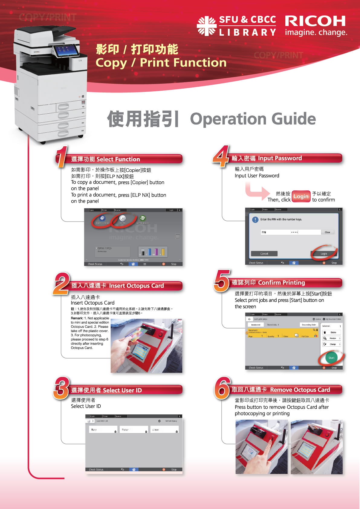 Five Octopus-operated multi-function photocopiers / printers (MFPs) are available in the Library, and three are located in the Learning Commons. Users are reminded that all photocopying and scanning activities must comply with copyright laws. Details of the MFPs and printing charges are provided below.