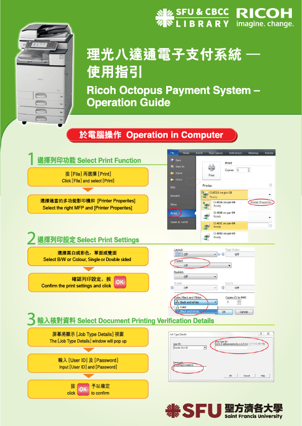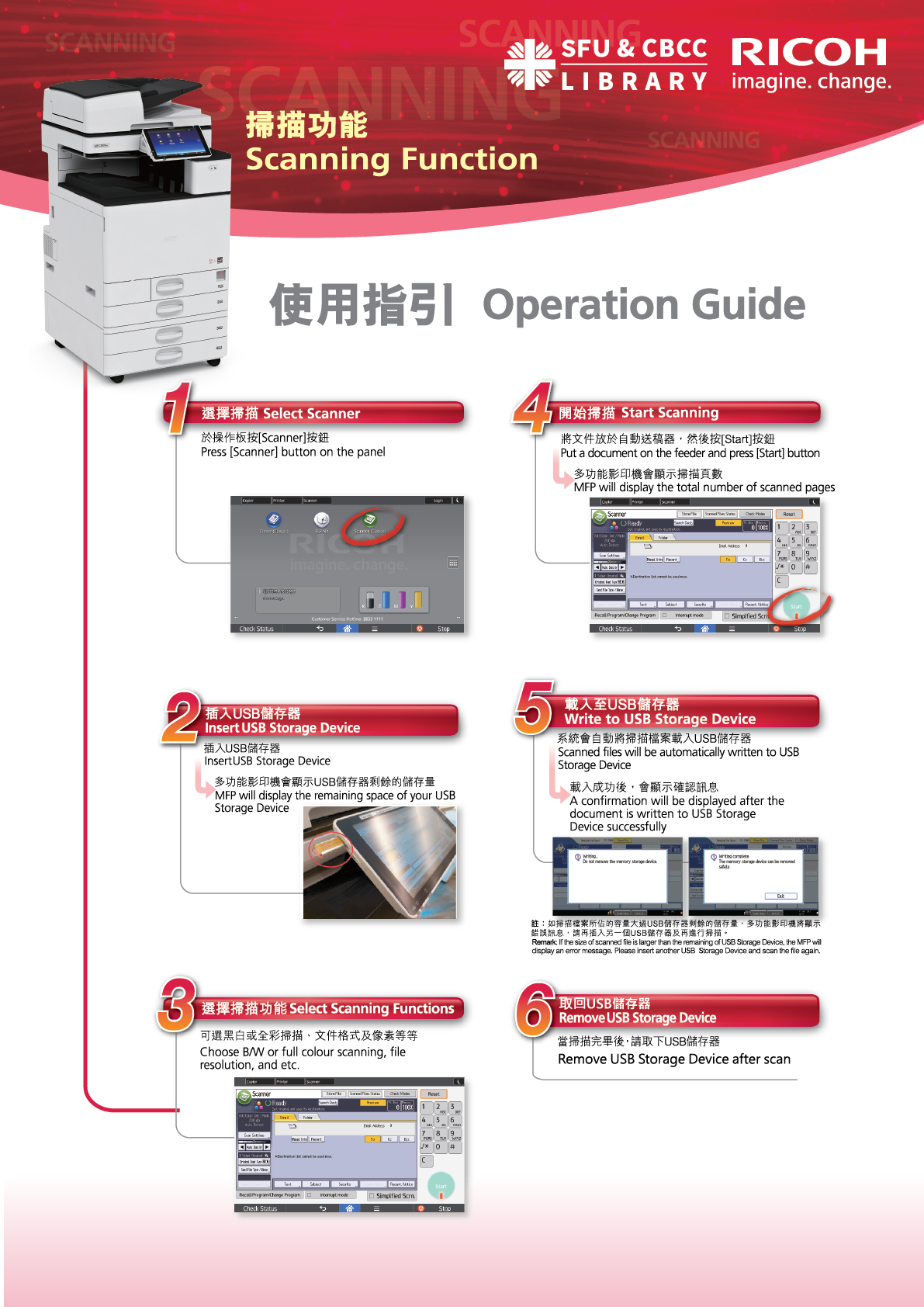 All photocopiers / printers (MFPs) are equipped with black/white and colour scanning functions. Users may scan files directly to their USB flash drives free of charge and refer to the following guides for scanning instructions.